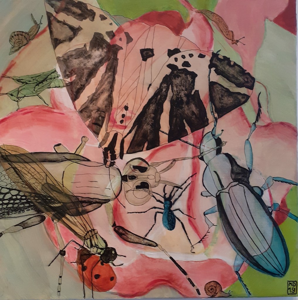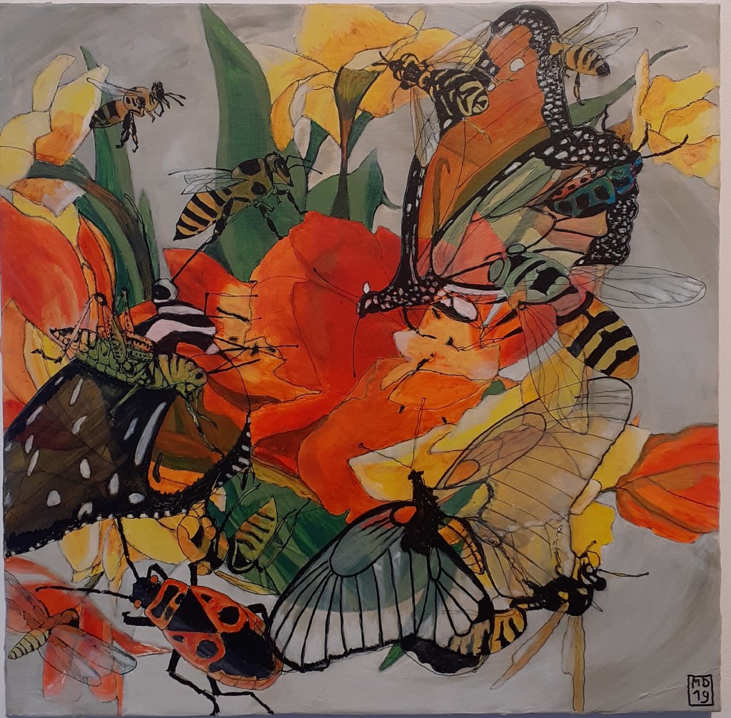 Peinture et graphisme, tel était le nouvel enjeu; et quoi de plus graphique que les insectes, qui sont présentés à la galerie Le Pavé d’Orsay sous le titre « des insectes et des hommes »,.