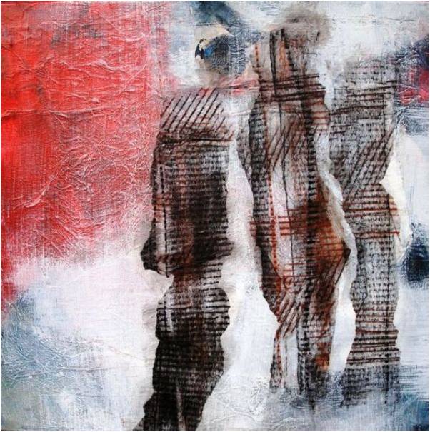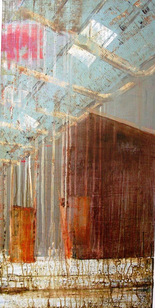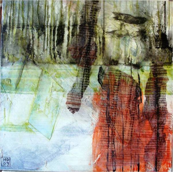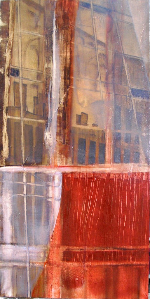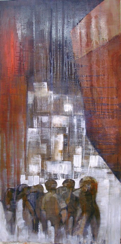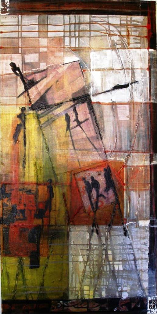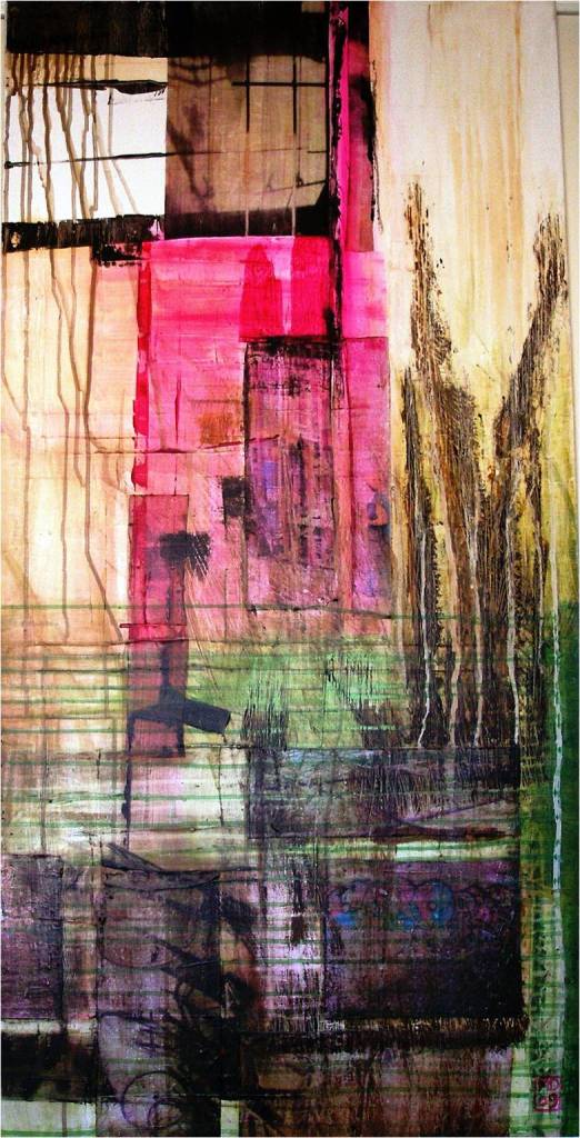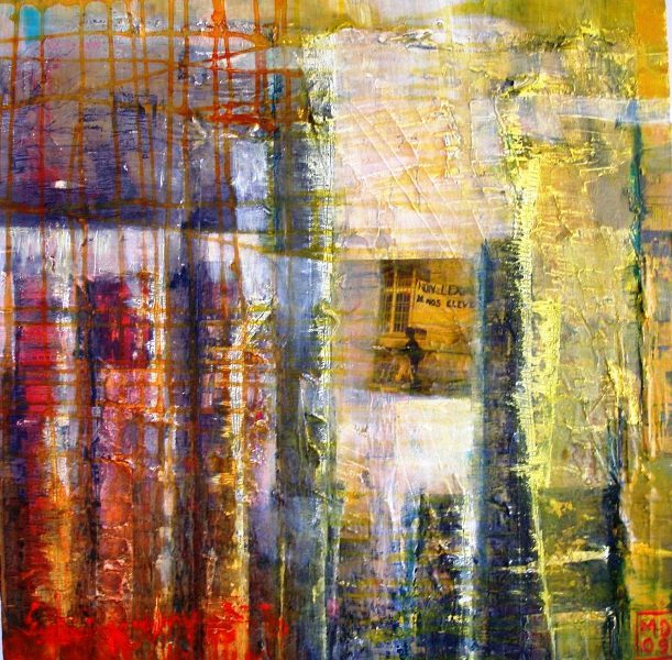 PEINDRE LA VILLE Les verticales qui s’enfoncent dans le sous-sol, deviennent racines, rocailles, matrices, qui se perdent dans le ciel, deviennent filaments, volutes insaisissables, qui se tordent sous l’effet du vent, de la pluie, de la pollution, équilibre instable au gré des catastrophes naturelles ou pas, lutte incessante entre l’infra et la superstructure, entre les fondements et la volatilité, entre le caché et le montré. Les horizontales pour dire une possible stabilité toujours remise en question. Les trames urbaines orthogonales, obliques, courbes ou vortex, réseaux organiques faits de rocs et de fluides, traces, rhizomes, et qui se superposent comme pour s’annuler, comme une superposition d’affiches, amoncellement, déchirement, et nouveau paysage, flou urbain qui vacille. Les paysages urbains, points de vue toujours instables, aux bribes vertes de nature recomposée, avec parfois un horizon vers un ailleurs incertain. Et les gens des villes, accrochés à la verticalité, les pieds sur une horizontalité de passage, traversés de réseaux, de trames, de fibres vibrantes, pris dans les trames urbaines et comme électrifiés; aux visages traversés de néons et d’éclats de façades. Organiques pris dans le minéral, certains luttent parfois, d’autres se rigidifient sur place, prennent racine, ou retrouvent leurs racines, « la possibilité d’une île ». MD juin 2009